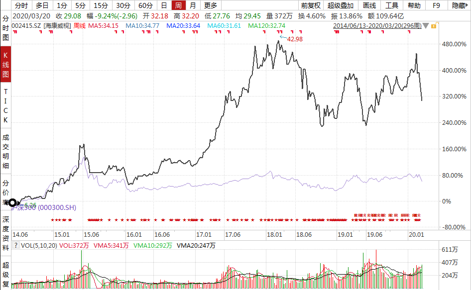 下面这张图截自Wind,可以看到海康在2016年之前,基本上和沪深300指数是重合的,基本上没有什么超额收益。一直到2016年,海康的股价明显拉高,而且相对沪深300的超额收益越来越大(开口越来越大),一直持续到18年一季度,之后这两年基本没涨。