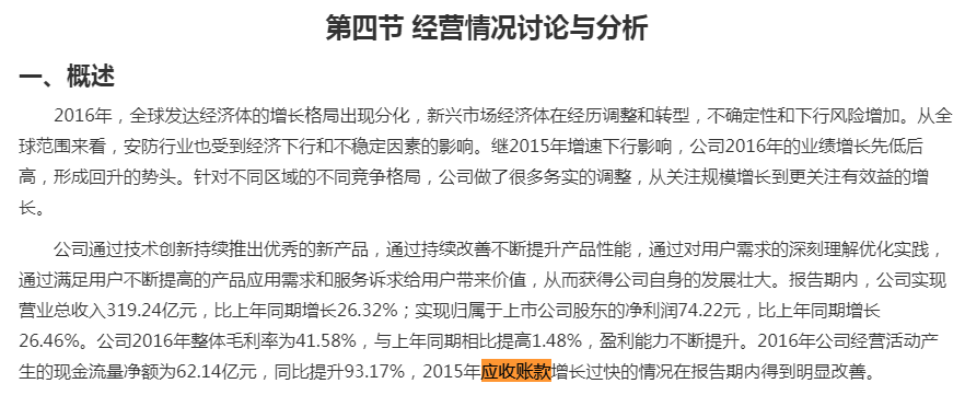 上图是海康威视2016年的年报,可以看到2015年应收账款过快增长的情况得以明显改善的原因,是“公司通过技术创新推出优秀产品,提升产品性能,满足客户需求”做到的。