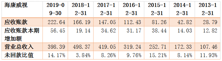 下面这个案例,是海康威视13年-19年Q3的应收账款情况。通过这张表可以看出,海康在2015年未回款比值有较大的提升,但是到了2016年这项指标再次回到了10%以下。大家要知道,一家公司的未回款比值在10%以下,说明公司的回款能力很强,这意味着一年的销售收入中,只有不到10%的钱没收回来,而且只是暂时没收回来而已(时间越长收回来的可能性越低)。