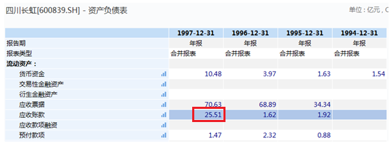 98年,长虹的归母净利润同比为负,这是历史上首次,刚才已经提到。但是98年年报出来是什么时候?是99年一季度了,这时候股价已经跌了很多。但如果我们注意到长虹在97年的应收账款大幅增长,并去查明原因的话,你完全可以在98年一季度的时候逃掉后面的下跌。