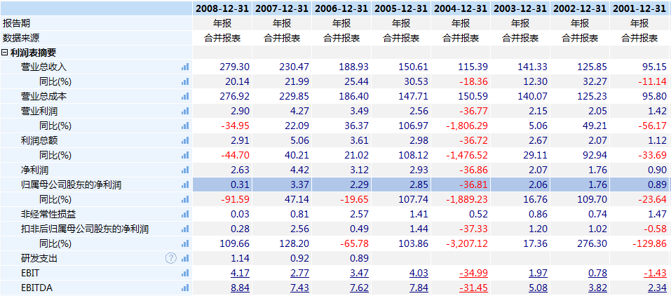 但是后面长虹的业绩就不行了,1998年——2001年,归母净利润连续负增长,股价也从1998年的高点一路下滑(下跌开始的节点与业绩下滑的节点非常吻合)。后来,长虹在2004年更是出现了巨大的亏损,这是长虹自打上市以来的首次亏损。